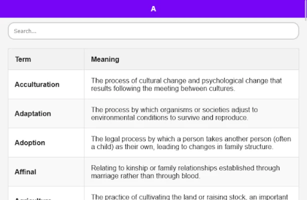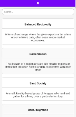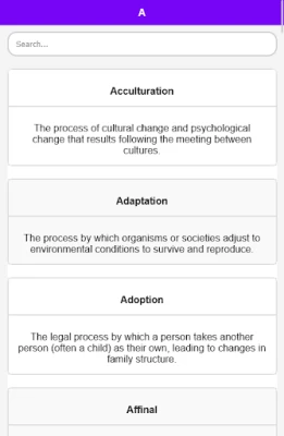 Advanced Search Feature: Locate specific terms and definitions instantly with our powerful search functionality. Simply enter a word, and the anthropology dictionary app will deliver relevant results in seconds, streamlining your research and study process.