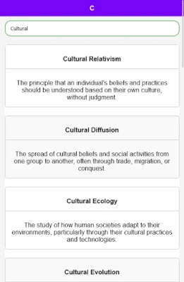 In-Depth Definitions: Each term in the anthropology dictionary app is accompanied by a thorough and precise definition. Gain a deeper understanding of anthropological concepts with clear and accurate explanations, ideal for both academic study and professional use.